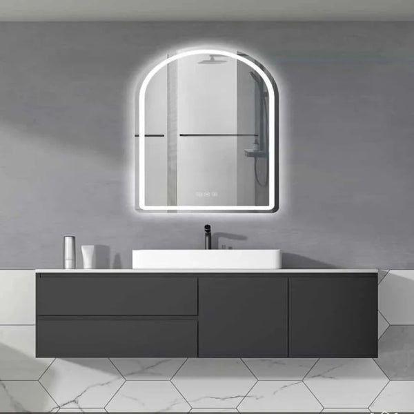 ✔ Rectangular LED wall mirror with curved top design